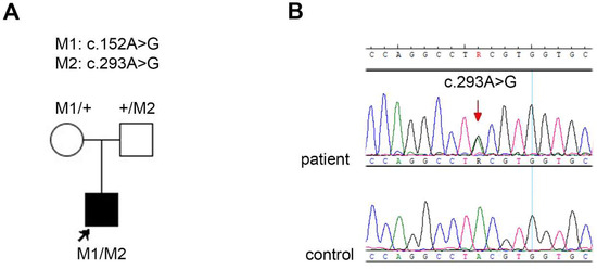 We discovered a novel variant, c.293A>G, p.(Tyr98Cys), in patient no. 35_40. The results of the segregation analysis in the family were consistent with the autosomal recessive mode of inheritance (see the pedigree and chromatogram in Figure 1).