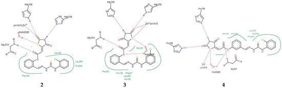 PoseView images for TZD–TSCs 2–4 into the open conformation of HDAC4o (PDB code: 2VQJ). Hydrophobic interactions are displayed as green contact curves; H-bonds and metal interactions are presented as dashed lines.