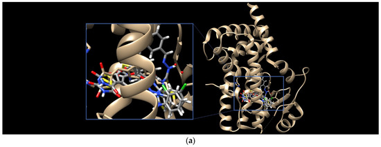 Docking was performed using the FlexX, as implemented in the LeadIT software package (LeadIT version 2.3.2; BioSolveIT GmbH, Sankt Augustin, Germany, 2017). Four crystal structures, PDB IDs: 2VQJ, 4CBY, 3SFF, and 6DGR, were obtained from RCSB Protein Data Bank. All steps of ligand and receptor preparation were carried out using the default settings in BioSolveIT’s LeadIT software. The binding sites were defined to include residues within a 6.5 Å radius around the native ligand. Soft docking (allowing for a volume overlap up to 100 Å3) was performed. The clash factor was set to 0.1. Other parameters were set to the default. The conformation with most favorable binding score was next selected for detailed evaluation of binding site interactions. For 2D visualization, the PoseView dock widget, as implemented in LeadIT software, version 2.3.2, was used. According to the PoseView dock widget, the green curves represent the hydrophobic contacts between at least three different ligand atoms and their surrounding residues.