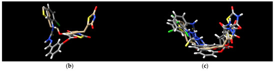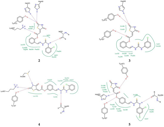 Finally, the binding modes of TZD–TSCs 2–5 to PPARγ LBD (PDB code 6DGR [61]) were investigated. As shown in Figure 6, all of them were identified as binding to PPARγ LBD in a U-shaped conformation, in analogy to the previously reported TZDs [24] and other known TZD-based agonists [61,62]. Additionally, all of them were identified as binding to the PPARγ LBD, with a binding mode very similar to the native agonist GDY ((5Z)-5-({4-[2-(thiophen-2-yl)ethoxy]phenyl}methylidene)-1,3-thiazolidine-2,4-dione) (Figure 6), and, at the same time, with much higher binding affinity (Table 1). As shown in Figure 7, the oxygen atoms of the TZD head groups of 2, 3, and 5 are H-bonded to the phenolic proton of Tyr473, and this interaction is essential for PPARγ activation [63]. In addition to the H-bond interaction with Tyr473, the TZD head groups of 2, 3, and 5 are stabilized by direct and indirect contact with the surrounding residues Phe282, Gln286, Ser289, His323, His449, and Leu469. The phenoxy group of ligands 2, 3, and 5, in turn, is placed in the center of the LBD and makes hydrophobic interactions with Cys285, Tyr327, Leu330, Phe363, and Met364, while, for the ester group, H-bond contacts with His323, Tyr327, and Lys367 were also predicted. The thiosemicarbazone tail, together with the distal chlorophenyl group, lies in the subpocket between H3, the β-sheet, and the Ω-loop, establishing numerous intermolecular interactions with the surrounding residues. Most of these interactions, especially with Ile341 (β-sheet), Met348 (β-sheet), and Phe264 (Ω-loop), are identical to those predicted for the pioneering series of TZDs [24].
