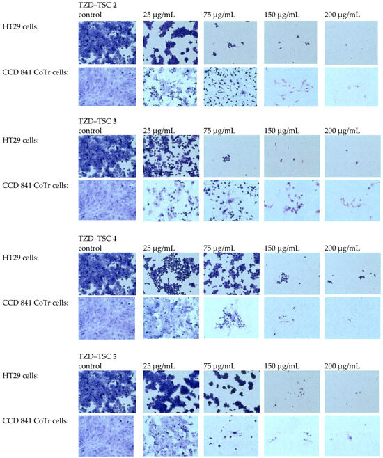 We found that the TZD–TSC-induced inhibition of HT29 cell proliferation is associated with a dose-dependent reduction in the number of stained cells (Figure 8), due to the detachment of the cells that are usually considered dead. Thereby, compounds 2–5, at the highest tested concentration of 200 µg/mL, possessed the strongest cytotoxic effect. Due to the exposure of HT29 cancer cells to compounds 2–5 in the cultures, effects such as cancer cells’ detachment from each other, their shrinkage, and the loss of intercellular interactions were also detected. Normal cells (CCD 841 CoTr) were also sensitive to the activity of the tested compounds. In accordance with antiproliferative assay results (Table 2), the compounds 4 and 5 were even more cytotoxic towards normal cells than cancerous HT29 cells. At the highest concentration tested (200 µg/mL), the cells shrank, leaving only the cytoplasmic lining connecting neighboring cells. In addition, a reduced number of cells was found, compared to the control.