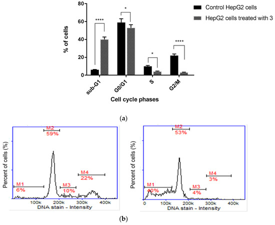 Cell cycle analysis of HepG2 cells (a) incubated for 24 h with TZD–TSC 3 at its IC50 concentration. Results are expressed as means ± SD. Statistical significance was designated as “****” when p < 0.0001 or “*” when p < 0.05 (vs. control cells), using ANOVA followed by Tukey’s post hoc test; (b) representative histograms of the untreated (control) HepG2 cells (left) and HepG2 cells treated with TZD–TSC 3 (right). M1, M2, M3, and M4 denote the cells in sub-G1, G0/G1, S, and G2/M phases, respectively.