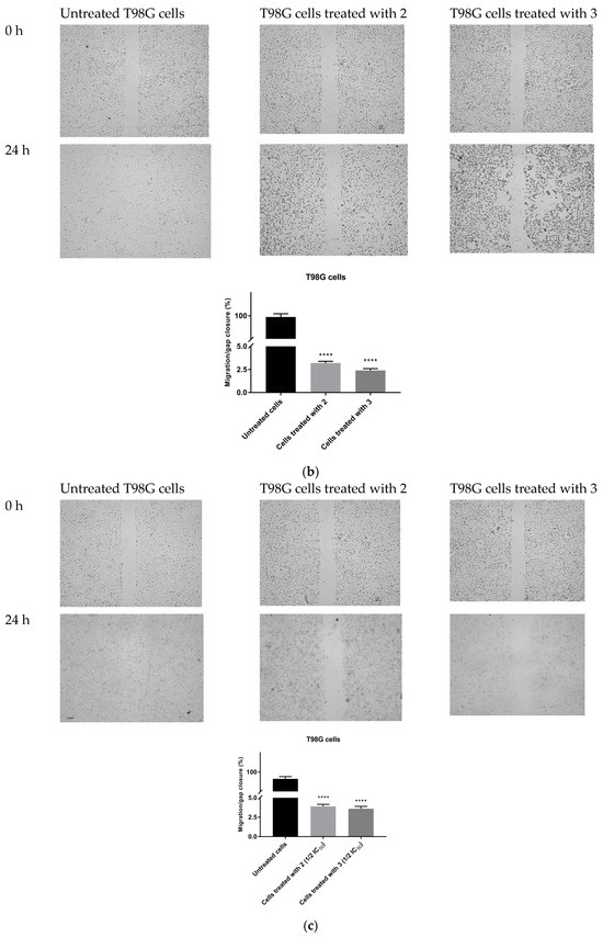 Anti-migratory effect of TZD–TSCs 2 and 3 against HepG2 and T98G cells. Representative images (taken at 20× magnification) and graphs represent: (a) HepG2 cells treated with IC50 concentrations of 2 (10.39 μM) and 3 (2.97 μM); (b) T98G cells treated with IC50 concentrations of 2 (26.82 μM) and 3 (28.34 μM); (c) T98G cells treated with ½ × IC50 concentrations of 2 (13.41 μM) and 3 (14.17 μM). Results were statistically analyzed by ANOVA with a post hoc Dunnett’s test. Statistical significance was designated as **** when p < 0.0001 (vs. untreated cells).