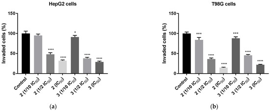 Anti-invasion effect of TZD–TSCs 2 and 3 against HepG2 and T98G cells, measured by ECM cell invasion assay (colorimetric); (a) HepG2 cells treated with 1/10 IC50, 1/2 IC50, IC50 concentrations of 2 and 3; (b) T98G cells treated with 1/10 IC50, 1/2 IC50, IC50 concentrations of 2 and 3. Results were statistically analyzed by ANOVA with post hoc Dunnett’s test. Statistical significance was designated as **** when p < 0.0001, *** when p < 0.001, and * when p < 0.05 (vs. control cells). For the IC50 values for 2 and 3 against HepG2 and T98G cells, see Table 2.
