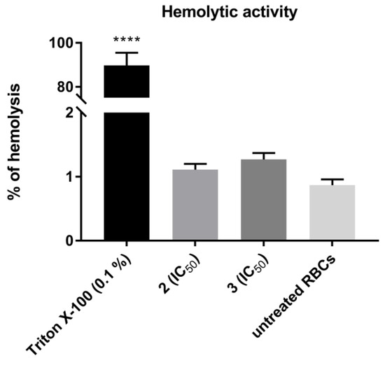 Hemolytic activity of TZD–TSCs 2 and 3 in human red blood cells (RBCs). Each bar expresses the mean ± SD (n = 4). Results were designated as statistically significant (ANOVA with post hoc Dunnett’s test) when p < 0.05 (vs. untreated RBCs). Statistical significance was designated as **** when p < 0.0001. TZD–TSCs 2 and 3 were tested at the concentrations equal to their IC50 values examined for the most sensitive cancer cell line (i.e., HepG2). Triton X-100 was used as a positive control.