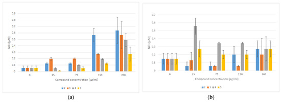 Nitrate, i.e., a stable end product of NO, was measured in culture supernatants with a spectrophotometric method based on the Griess reaction. Culture supernatants were collected from the cell cultures treated with specific concentrations of the tested compounds (25, 75, 150, and 200 μg/mL, respectively). Briefly, 100 μL of the culture supernatant was placed in 96-well flat-bottomed plates in triplicate and incubated with 100 μL of Griess reagent (1% sulfanilamide/0.1% N-(1-naphthyl)ethylenediamine dihydrochloride) in 3% H3PO4 at room temperature for 10 min. The optical density was measured at 550 nm using a microplate reader. A standard curve was prepared using 0.5–25 μM sodium nitrite (NaNO2) for calibration [78].