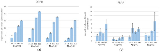 As shown in Figure 14, TZD–TSCs 2–5 possess both a free radical scavenging ability and the ability to reduce iron ions. With respect to the DPPH method, the scavenging activities of 2–5 were dose-dependent (14A). Compound 3, at the highest tested concentration of 200 µg/mL, possessed the strongest free-radical scavenging effect, equal to 21.439 µg/mL of Trolox. Also, for the remaining compounds, the highest DPPH radical reducing activity was observed when the highest tested concentration of 200 µg/mL was used. Among them, the highest DPPH reducing capacity was recorded for 4 (equal to 17.638 µg/mL of Trolox), followed by 5 (equal to 15.177 µg/mL of Trolox), and then 2 (equal to 15.068 µg/mL of Trolox). It is important to note that the SAR trend observed in the DPPH assay does not reflect the results obtained from FRAP. Indeed, as shown in Figure 14b, the most effective compound in the DPPH assay, compound 3, at the concentration of 200 μg/mL, showed the weakest reducing activity of the Fe3+ ion, equal to 1.89 µg/mL of ascorbic acid, whereas the same concentration of 5 exerted the strongest ferric-reducing power (FRAP), equal to ascorbic acid at 9.19 µg/mL. Moreover, unlike the DPPH method, the lack of dose-dependent ferric-reducing potency was observed for all tested compounds.