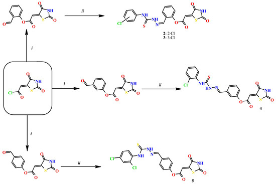 To a mixture of 0.001 mol of corresponding formylphenyl (2,4-dioxothiazolidin- 5-ylidene)acetate and 0.001 mol of corresponding 4-(chlorophenyl)thiosemicarbazide, 5 mL of ethanol was added. The reaction mixture was heated under reflux for 15 min. After cooling, the precipitate was filtered off and washed with ethanol. After drying, the precipitate was recrystallized from appropriate solvents, i.e., butanol for compounds 2, 3, and 5 and DMF:H2O (2:1) for compound 4.