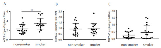 ACE2, TMPRSS2, and MUC5AC mRNA expression in smokers and non-smokers. ACE2 mRNA expression was detected in conjunctival impression cytology (IC) samples and was significantly higher in smokers than in non-smokers (A); p < 0.01. TMPRSS2 and MUC5AC mRNA were also detected but were not highly expressed in smokers (B,C). The horizontal bar represents the groups, while the vertical bar represents the mRNA copies/ng total RNA. ACE2 mRNA is expressed in smokers. ** p < 0.01 was calculated using the Mann–Whitney U test.