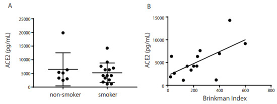 ACE2 production in Schirmer’s strip samples, and correlation between ACE2 and the Brinkman index (BI). ACE2 production was detected in Schirmer’s strip samples, but no significant difference was observed between smokers and non-smokers ((A) p = 0.34). A significant correlation was found between ACE2 in Schirmer’s strip samples and the BI ((B) r = 0.63, p = 0.02). The horizontal bar represents the BI score, whereas the vertical bar represents the ACE2 concentration in Schirmer’s strip samples (pg/mL). Statistical significance was calculated using the Mann–Whitney U test (A), and the correlation coefficient was analyzed using Spearman’s rank correlation (B).