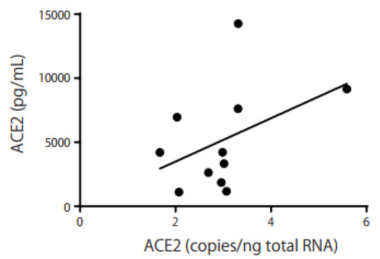 Correlation between ACE2 mRNA and protein. A weak correlation was observed between the ACE2 mRNA and protein levels (r = 0.43). The horizontal bar represents the ACE2 mRNA copies/ng of total RNA, while the vertical bar represents the ACE2 protein concentration in Schirmer’s strip samples (pg/mL). The correlation coefficients were analyzed using Spearman’s rank correlation.