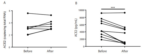 The washing effect on ACE2 mRNA and protein production in Schirmer’s strip samples. ACE2 mRNA expression was not significantly reduced through washing the eye for 30 s with a 5 min rest period ((A) p = 0.08), but the ACE2 protein levels in the Schirmer’s strip samples were significantly reduced ((B) p < 0.001). *** p < 0.001 was calculated using the paired t-test.