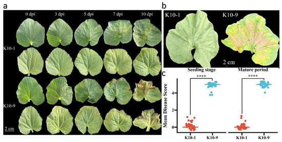 Phenotypic responses of melon to P. cubensis infection. (a) Phenotypic observations of seedling leaves ‘K10-1′ and ‘K10-9′ were recorded at intervals of 3, 5, 7, and 10 days post-inoculation (dpi). (b) Field phenotypes of leaves from ‘K10-1′ and ‘K10-9′ were documented at 15 dpi. (c) Dispersed boxplots present the DM scores for ‘K10-1′ and ‘K10-9′ across various stages (n = 30 for ‘K10-1′ and ‘K10-9′). Both seedlings and field assays were executed with a minimum of three replicates, consistently yielding similar results. Each replication comprised at least 30 plants. A t-test revealed a statistically significant difference (**** p < 0.0001) between ‘K10-1′ and ‘K10-9′.