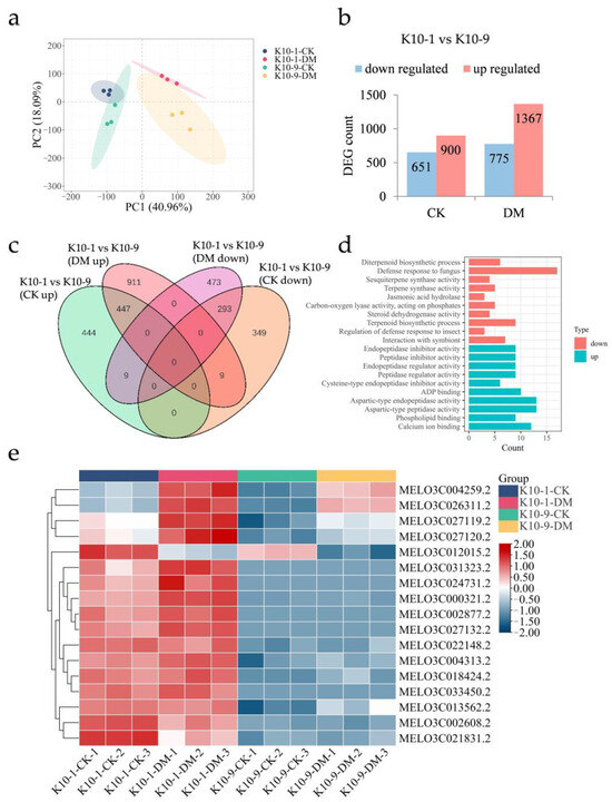 Transcriptomic analysis of resistant ‘K10-1′ and susceptible ‘K10-9′’ leaves following P. cubensis infection. (a) PCA of the transcriptome data differentiates samples: ‘CK’ represents non-manipulated controls, ‘DM’ signifies samples collected 48 h post-P. cubensis inoculation. (b) Tabulation of differentially expressed genes (DEGs) showcases both up-regulated and down-regulated genes when contrasting ‘K10-1′ and ‘K10-9′ under both treated and control conditions. Here, ‘K10-1′ serves as the resistance reference. (c) A Venn diagram delineates the DEGs that are both unique and shared between the resistant ‘K10-1′ and the susceptible ‘K10-9′ across both treatment and control groups. (d) Gene ontology (GO) enrichment analysis identifies terms related to the 293 DEGs consistently expressed at higher levels in ‘K10-1′ compared to ‘K10-9′ and the 447 DEGs consistently expressed at lower levels under both treatment and control conditions. A threshold q-value of ≤ 0.05 was maintained. (e) A heat map visually represents the expression patterns of 17 genes associated with fungal defense responses, which consistently exhibit higher expression levels in ‘K10-1′ than in ‘K10-9′ across both the control and treatment groups in melon leaves.