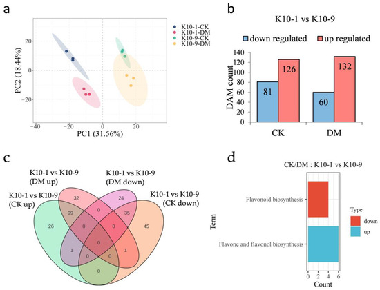 Metabolomic profiling of resistant ‘K10-1′ and susceptible ‘K10-9′ leaves following P. cubensis infection. (a) PCA delineates variations within the metabolomic dataset. (b) A comprehensive list presents both up-regulated and down-regulated differentially accumulated metabolites (DAMs) when contrasting ‘K10-1′ and ‘K10-9′ under treated and control conditions. In this context, ‘K10-1′ functions as the reference for resistance. (c) A Venn diagram differentiates the DAMs that are either unique or shared between the resistant ‘K10-1′ and the susceptible ‘K10-9′ across both the treatment and control conditions. (d) KEGG enrichment analysis reveals pathways related to the up-regulated and down-regulated DAMs identified between ‘K10-1′ and ‘K10-9′ under both treated and control scenarios. A significance threshold q-value of ≤0.05 was maintained.