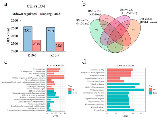 Post-infection, ‘K10-1′ registered significant up-regulation in 759 genes and down-regulation in 815 genes. ‘K10-9′ demonstrated significant up-regulation in 735 genes and down-regulation in 804 genes (Figure 4b). GO enrichment analysis highlighted genes exclusive to ‘K10-1′ with an elevated expression being affiliated with DNA repair (GO:0006281), cellular response to DNA damage stimulus (GO:0006974), and recombinational repair (GO:0000725). Conversely, genes with a suppressed expression in ‘K10-1′ were linked to phloem development (GO:0010088), phloem or xylem histogenesis (GO:0010087), and the regulation of cell wall organization or biogenesis (GO:1903338) (Figure 4c). Genes with a diminished expression in ‘K10-9′ were predominantly involved in the mitotic cell cycle (GO:0000278), polymeric cytoskeletal fiber (GO:0099513), and microtubule cytoskeleton (GO:0015630), while those with an augmented expression participated in response to water deprivation (GO:0009414), water response (GO:0009415), and salicylic acid response (GO:0009751) pathways (Figure 4d).