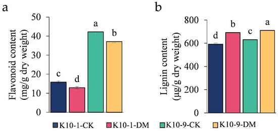 Analysis of content variability in (a) total flavonoids; (b) total lignin. Each error bar denotes the mean ± standard deviation derived from three independent biological replicates. Distinct letters signify statistically significant differences (p < 0.05) among groups, as determined by Duncan’s multiple range test.