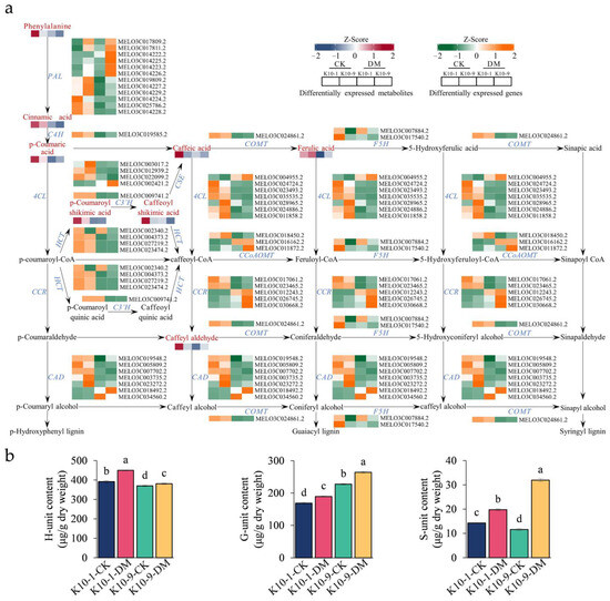 Expression and accumulation profiles of lignin biosynthesis-related genes and metabolites in resistant ‘K10-1′ and susceptible ‘K10-9′ pre- and post-inoculation with P. cubensis. (a) Profiling of transcripts and metabolites related to the 47 differentially expressed genes (DEGs) and 12 differentially accumulated metabolites (DAMs) implicated in lignin biosynthesis pathways in both ‘K10-1′ and ‘K10-9′. These include PAL (phenylalanine ammonia-lyase), C4H (trans-cinnamate 4-monooxygenase), 4CL (4-coumarate-CoA ligase), CCR (cinnamoyl-CoA reductase), CAD (cinnamyl-alcohol dehydrogenase), HCT (shikimate O-hydroxycinnamoyltransferase), C3′H (5-O-(4-coumaroyl)-D-quinate 3′-monooxygenase), CCoAOMT (caffeoyl-CoA O-methyltransferase), COMT (caffeic acid 3-O-methyltransferase), F5H (ferulate-5-hydroxylase), and CSE (caffeoylshikimate esterase). (b) Analysis of G, H, and S monomers present in the leaves of ‘K10-1′ and ‘K10-9′ across both the treatment and control groups. Each error bar illustrates the mean ± standard deviation derived from three independent biological replicates. Distinct letters denote statistically significant differences (p < 0.05) among groups, as determined by Duncan’s multiple range test.