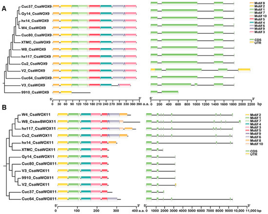 2.2. Gene Structure and Motif Composition of CsWOXs