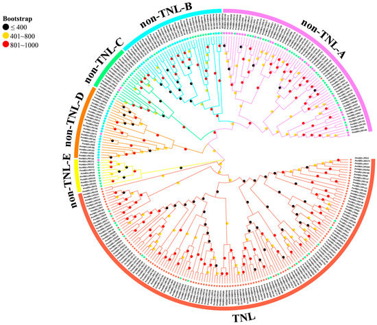 The NBS domain region sequences were extracted from 292 NBS-LRR genes, and MEGA7.0 was used for their phylogenetic analysis. The resulting phylogenetic tree shows that the 292 NBS-LRR disease resistance proteins could be clearly divided into two large branches (Figure 1): TNL and non-TNL, with the non-TNL branch further divided into five small branches (non-TNL-A, non-TNL-B, non-TNL-C, non-TNL-D, and non-TNL-E). TNL subclass genes are basically homogenous in the large TNL branch. The NL subtype genes were distributed in the two large branches, with more genes in the non-TNL large branch than in the TNL large branch, indicating that the origin of these subtypes’ genes was more diverse. The genes of each subclass in the non-TNL large branch were not clustered on one branch as clearly as the TNL subclass genes were. The NL subclass genes were mainly clustered in the non-TNL-C and non-TNL-E small branches. The genes of RNL subtypes were mainly clustered in the non-TNL-B and non-TNL-D branches, and the CNL subtype genes were mainly clustered in the non-TNL-A branch. Apart from most genes of each subtype being clustered in one branch, there were a few genes scattered in other small branches.