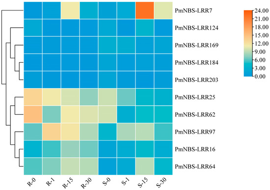 The NBS-LRR genes from resistant and susceptible P. massoniana responsive to PWN inoculation were obtained from the transcriptome data. An FDR ≤0.05 and a fold-change ≥2 were used for the identification of the differentially expressed genes (DEGs). A hierarchical Cluster heatmap based on NBS-LRR DEGs analysis was conducted with TBtools.