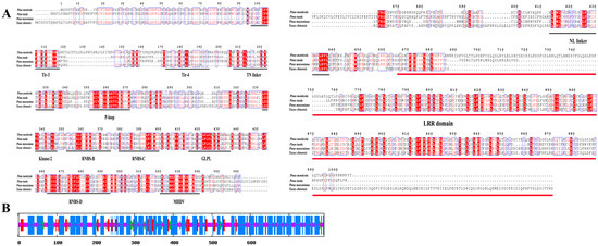 Sequence analysis showed that the PmNBS-LRR97 gene sequences in resistant and susceptible P. massoniana were entirely identical. The full-length cDNA of the sequence was 2373 bp, encoding a total of 790 aa (Figure 3A), with a molecular weight of 90.213 kDa and an isoelectric point of 6.18. It is an unstable protein given its instability index of 98.04; it is a thermophilic protein whose grand average for hydrophilicity is less than 0, meaning that it is also a hydrophilic protein; it lacks both a signal peptide and a transmembrane domain; and it contains 61 phosphorylation sites.