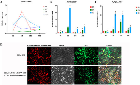Expression pattern and subcellular localization of PmNBS-LRR97 in resistant and susceptible P. massoniana. (A) Expression patterns of PmNBS-LRR97 in resistant and susceptible P. massoniana inoculated with the PWN at 0, 1, 15, and 30 dpi. Error bars represent three biological replicates ± SD. RI and RW represent resistant P. massoniana inoculated with the PWN and water, respectively; SI and SW represent susceptible P. massoniana inoculated with the PWN and water, respectively. Susceptible P. massoniana at 0 days of water inoculation served as a control. (B) The expression patterns of PmNBS-LRR97 in different tissues at different stages of the resistant P. massoniana inoculated with the PWN. Error bars represent three biological replicates ± SD. RR, RN, and RS represent the root, stem, and needle of resistant P. massoniana, respectively. The root of resistant P. massoniana was used as the control in each period. (C) The expression patterns of PmNBS-LRR97 in different tissues at different stages of susceptible P. massoniana inoculated with the PWN. Error bars represent three biological replicates ± SD. SR, SN, and SS represent the root, stem, and needle of susceptible P. massoniana, respectively. The root of susceptible P. massoniana was used as the control in each period. Student’s t-test was used to test the significance (*, p < 0.05; **, p < 0.01). (D) Subcellular localization of the PmNBS-LRR97. Empty vector containing the 35S promoter and PmNBS-LRR97 co-localized with cell membrane markers, respectively. Scale bar = 50 μm.