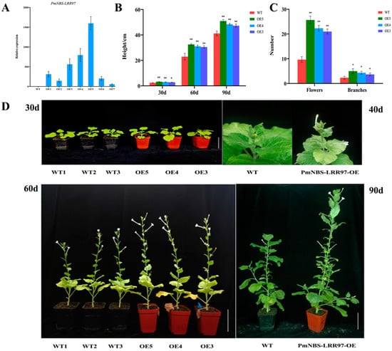 Quantitative verification and phenotypic difference analysis of PmNBS-LRR97-overexpressing tobacco. (A) Relative expression of PmNBS-LRR97 in WT and transgenic tobacco; error bars represent three biological replicates ± SD. (B) Plant height analysis of WT and PmNBS-LRR97-overexpressing tobacco at 30, 60, and 90 d; error bars represent three biological replicates ± SD. Student’s t-test was used to test the significance (*, p < 0.05; **, p < 0.01). (C) Differences in the flowering number and branch number between WT and PmNBS-LRR97-overexpressing tobacco at 90 d; error bars represent three biological replicates ± SD. (D) Different phenotypes of WT and PmNBS-LRR97-overexpressing tobacco. Scale bar = 7 cm.