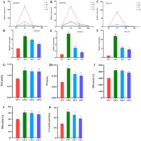 Physiological differences between P. massoniana and tobacco. (A–C) Expression patterns of PmSOD, PmPOD, and PmCAT in resistant and susceptible P. massoniana inoculated with the PWN at 0, 1, 15, and 30 dpi. Error bars represent three biological replicates ± SD. RI and RW represent resistant P. massoniana inoculated with the PWN and water, respectively; SI and SW represent susceptible P. massoniana inoculated with the PWN and water, respectively. Susceptible P. massoniana at 0 days of water inoculation served as a control. (D–F) Differences in the relative expression levels of NbSOD, NbPOD, and NbCAT in WT and transgenic tobacco. (G–K) The contents of H2O2, NO, SOD, POD, and CAT were different between WT and PmNBS-LRR97-overexpressing tobacco. Error bars represent three biological replicates ± SD. The difference was statistically significant by Student’s t-test analysis (**, p < 0.01).