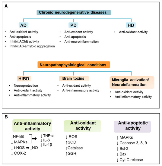 Neuroinflammation is a common pathological process in several neurological diseases, and it is associated both with the mechanisms underlying neurodegenerative diseases, such as Alzheimer’s (AD) and Parkinson’s (PD) diseases, and infectious neuropathology [74]. In a chronic oxidative stress state, the increase in reactive species, such as ROS and nitrogen reactive species (RNS), induces alteration in the intracellular signaling pathways involved in cell metabolism, leading to an enhanced secretion of proinflammatory molecules, thus promoting a dysregulation of the inflammatory response. In the central nervous system (CNS), the main player in neuroinflammation is microglia, a type of differentiated tissue macrophage, responsible for immune responses and homeostasis of CNS. Activated microglial cells induce the production of proinflammatory cytokines and inflammatory mediators, including interleukin (IL)-1β, IL-6, nitric oxide (NO), and tumor necrosis factor (TNF)-α, which amplify inflammatory responses in the brain leading to neuroinflammation. Nuclear factor-kappa B (NF-kB) and mitogen-activated protein kinase (MAPK) are two critical signaling pathways regulating pro-inflammatory cytokines expression during the inflammation process [75,76].