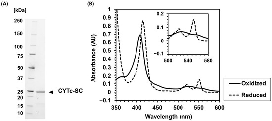 The expression vector for CYTc-SC (Supplementary Materials, Figure S1) was transformed into the E. coli BL21(DE3) host strain containing pEC86, which was inserted by ccm operon [36]. CYTc-SC was expressed as a soluble protein and purified using Ni2+ affinity chromatography. The SDS-PAGE analysis of purified CYTc-SC showed a band at the expected molecular weight of 23 kDa (Figure 1A). This result confirms the expression of CYTc-SC as a soluble fusion molecule in the host strain.