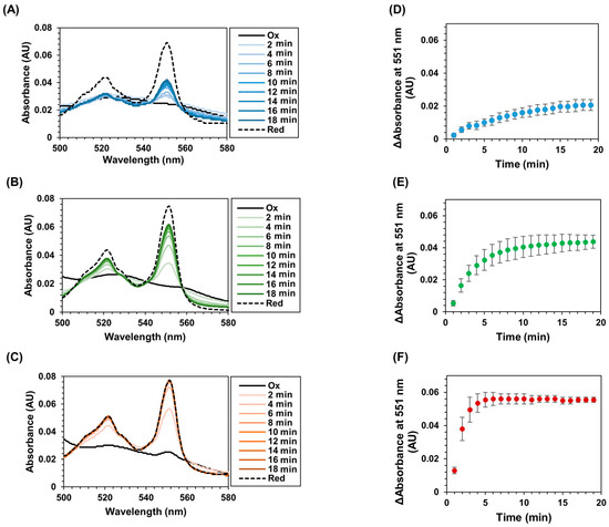 To investigate the ability of intramolecular electron transfer from the flavin cofactor to heme c in the CYTc-SC/ST-Enzymes, changes in the absorbance spectra in the presence of the substrate were observed. The time-dependent absorbance spectra are shown in Figure 3 and Supplementary Materials Figure S3. After the addition of the substrate, a shift of the peak from 409 nm to 415 nm, corresponding to the Soret band of heme c, was observed. Simultaneously, an increase in the absorbance peaks at 521 nm and 551 nm derived from the Q bands of reduced heme c was observed in all cases of CYTc-SC/ST-Enzyme complexes. These results suggest that the addition of substrates for each complex resulted in the reduction of the flavin cofactor, followed by the intramolecular electron transfer from the reduced flavin cofactor to heme c. Consequently, the characteristically reduced heme c spectrum was observed. Thus, the CYTc-SC/ST-Enzyme complexes acquired the intramolecular electron transfer ability from flavin cofactor to heme with substrate oxidation by the complexed ST-Enzyme.