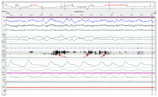 In some patients, abnormal motor activity in the REM sleep phase was noted during episodes of apnea, and not at the end of them, as is usually the case for patients with obstructive or central sleep apnea (Figure 2).