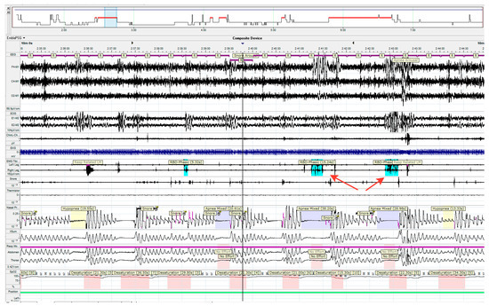Figure 1. Polysomnography of patient with REM sleep behavior disorder (RBD), 30 s epoch of REM sleep. REM sleep without atonia (RWA). The arrows indicate the transient EMG bursts during REM sleep in the muscle channels (m. tibialis anterior of the left and right legs).