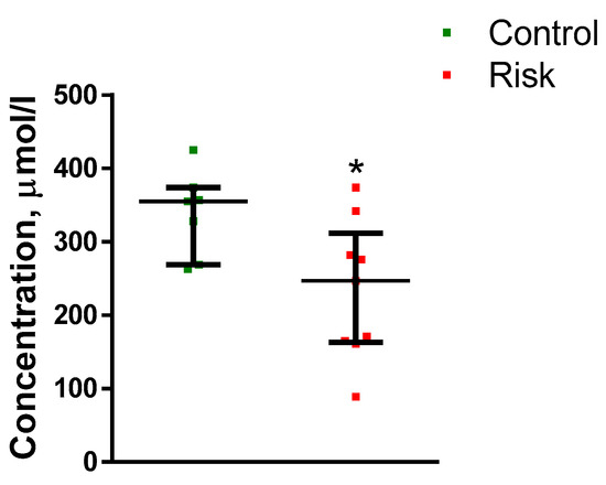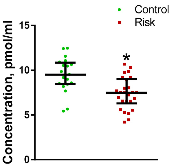 Figure 6. Plasma l-3,4-dihydroxyphenylalanine (L-DOPA) concentration in patients in the control group and in the risk group for developing Parkinson’s disease. * p < 0.05, statistically significant differences. Data presented as a median with an interquartile range and min–max values.