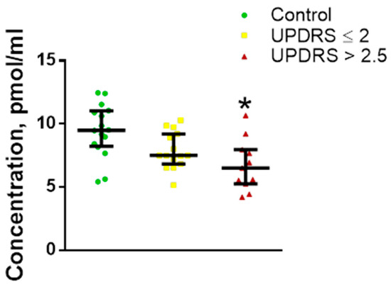 Figure 7. L-3,4-dihydroxyphenylalanine (L-DOPA) concentration in the risk subgroup with mild non-Parkinsonian motor impairment (UPDRS > 2.5 points) and in the risk subgroup without motor impairment (UPDRS ≤ 2 points) compared with control. * p < 0.05, statistically significant differences. UPDRS—Unified Parkinson’s Disease Rating Scale. Data presented as a median with an interquartile range and min–max values.