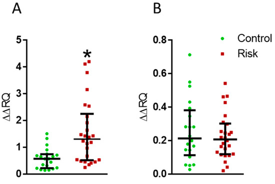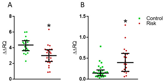 Figure 10. (A) Changes in the PARK7 gene expression in the patients at risk of developing Parkinson’s disease compared with the controls. (B) Changes in the LAG3 gene expression in the patients at risk of developing Parkinson’s disease compared to controls. ∆∆RQ, the change in gene expression normalized to the housekeeping gene. * p < 0.05, statistically significant differences. Data presented as a median with an interquartile range and min–max values.