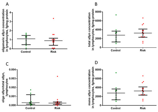Figure 11. Concentrations of total α-synuclein (A), monomeric α-synuclein (B), and oligomeric α-synuclein (C), as well as the ratio of oligomeric α-synuclein to total α-synuclein (D) in lymphocytes in the patients at risk and in the control group. Data presented as a median with an interquartile range and min–max values.