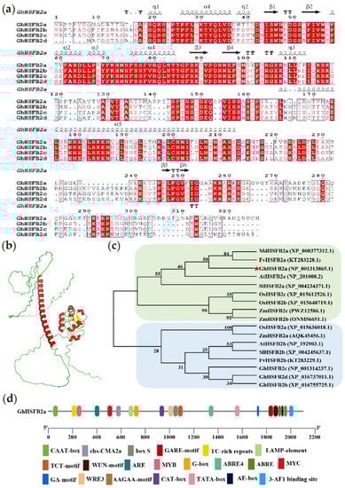 Structural characteristics of GhHSFB2a. (a) Multiple sequence alignment of GhHSFB2a, GhHSFB2b, GhHSFB2c, and GhHSFB2d proteins. The common residues of the four sequences are displayed in white letters on a red square, and similar residues are shown in red. The black dot represents a single-amino-acid deletion, and the black arrow and coiled helix represent the predicted secondary structure. (b) Three-dimensional GhHSFB2a model. (c) Phylogenetic tree analysis of HSFB2 proteins from Gossypium hirsutum (Gh), Solanum lycopersicum (SI), Arabidopsis thaliana (At), Fragaria vesca (Fv), Malus domestica (Md), Oryza sativa (Os), Zea mays (Zm). (d) Cis-acting element analysis of GhHSFB2a promoter region.