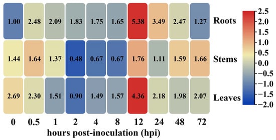 Expression of GhHSFB2a in cotton inoculated with V. dahliae. Heat map analysis of GhHSFB2a gene expressions in different organs (roots, stems, and leaves) and different inoculation time (0, 0.5, 1, 2, 4, 8, 12, 24, 48, and 72 hpi) with V. dahliae of Coker 312 cotton. The color from blue to red indicates low to high expression.