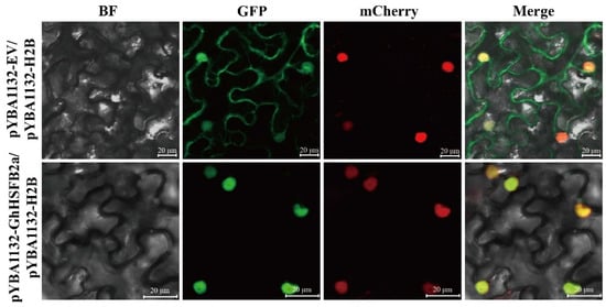 WoLF PSORT analysis (https://wolfpsort.hgc.jp/) (accessed on 2 August 2022) indicated that GhHSFB2a is localized to the nucleus. To determine the subcellular localization of GhHSFB2a, the full-length GhHSFB2a cDNA was amplified and introduced into the pYBA1132 vector to generate the pYBA1132::GhHSFB2a::eGFP construct. A. tumefaciens strain EHA105 containing pYBA1132::GhHSFB2a::eGFP or pYBA1132::eGFP (control) and pYBA1132::H2B::mCherry was co-injected into N.benthamiana leaves, and the signals were observed under a fluorescence confocal microscope (ZEISS LSM980 with Airyscan2) at 48 h post-infiltration.