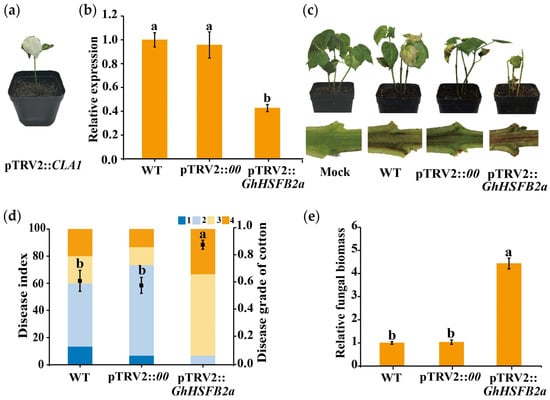 Loss-of-function experiments in cotton seedlings were performed to investigate the role of GhHSFB2a in immunity against V. dahliae, using the VIGS assay. We generated the recombinant pTRV2::GhHSFB2a construct and inoculated it into seedlings when the two cotyledons were fully developed. The emergence of photobleaching on the pTRV2::CLA1 cotton plants was regarded as the success of the experiment (Figure 4A). A RT-qPCR was used to determine the expression levels of pTRV2::GhHSFB2a and pTRV2::00 in plants. Transcript levels of GhHSFB2a were significantly reduced compared to those in control plants, validating the successful knockdown of the gene (Figure 4b). For the WT, the pTRV2::00, GhHSFB2a-silenced cotton was infected with V991, and water treatment was used as a control. Cotton disease progression was observed after V991 inoculation for two weeks, and the GhHSFB2a-silenced cotton exhibited evident stunting and wilting leaves, and the DI increased significantly. Cotton stems dissected longitudinally showed more pronounced browning of the vascular tissue compared to the WT cotton (Figure 4c,d). The fungal biomass was obviously increased in GhHSFB2a-silenced cotton compared to that in WT (Figure 4e). These results indicated that silencing GhHSFB2a increased fungal colonization and attenuated resistance against V. dahliae.