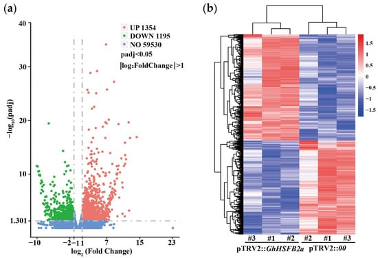 Analysis of DEGs in pTRV2::00 and pTRV2::GhHSFB2a. (a) Volcano plot, identification map of DEGs using Log2 (Fold Change) > 1 and padj < 0.05. (b) Heatmap of DEGs of each sample.