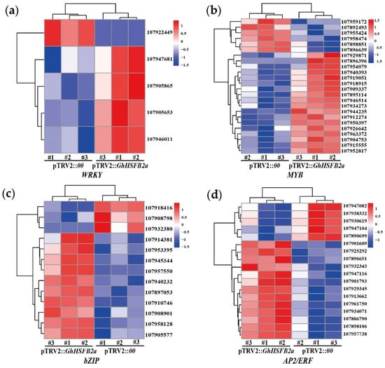 Expression of transcription factor genes associated with plant resistance in pTRV2::00 vs. pTRV2::GhHSFB2a. Heat maps indicating expression comparison of enzyme genes or transcription-factors among four comparison sets. (a) WRKY. (b) MYB. (c) bZIP. (d) AP2/ERF. Red represents up-regulation and blue represents down-regulation.