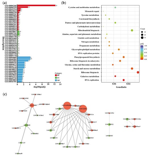 GO, KEGG enrichment, and PPI analysis for DEGs in pTRV2::00 and pTRV2::GhHSFB2a cotton. (a) GO classification of DEGs in pTRV2::00 vs. pTRV2::GhHSFB2. BP, biological process; CC, cell component; MF, molecular function. (b) KEGG enriched bubble map of DEGs in pTRV2::00 vs. pTRV2::GhHSFB2a. (c) PPI analysis of DEGs in pTRV2::00 vs. pTRV2::GhHSFB2a. The size of the nodes was set according to their degree using Cytoscape. Red nodes represent upregulated genes and green nodes represent downregulated genes.
