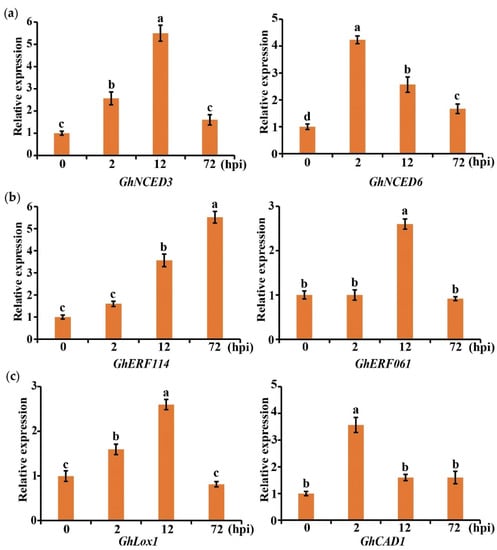 To determine whether the expression of marker genes in the pathway related to plant hormones and secondary metabolites was induced by V. dahliae, cotton was infected with V991 and sampled at 0, 2, 12, and 72 hpi. The expression levels of marker genes selected from ABA (GhNCED3, LOC107918579; GhNCED6, LOC107890583), ethylene (GhERF114, LOC 107925292; GhERF061, LOC107947116), linoleic acid (GhLox1, LOC107919998), and phenylpropane (GhCAD1, LOC107953373) were detected using a qRT-PCR. It was found that these marker genes were expressed to different degrees. GhERF114 was induced to the greatest extent, and its gene expression was about six times as much as that of the control (Figure 8). These results indicate that ABA, ethylene, linoleic acid, and phenylpropane-related marker genes in cotton are induced in response to the infection caused by V. dahliae.