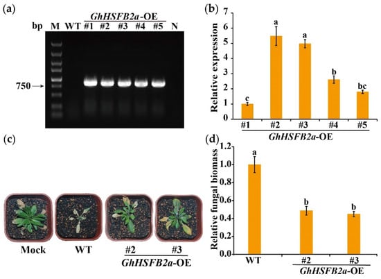 To further confirm the role of GhHSFB2a in resistance to V. dahliae, GhHSFB2a was overexpressed (OE) in A. thaliana using the flower-dipping method. The results show that the target band could not be amplified from the DNA of WT A. thaliana and the negative control, but approximately 950 bp amplification products were detected in the DNA of overexpressed transgenic lines (Figure 9a). Among the five positive lines, OE-2 and OE-3, two lines with higher expression levels, were screened using a qRT-PCR and were selected for subsequent experiment. (Figure 9b). After inoculation of the WT and transgenic lines with V991, the WT leaves had more severe etiolation and wilting phenotypes than OE-2 and OE-3, and fungal biomass was significantly reduced (Figure 9c,d). These results indicate that ectopic expression of GhHSFB2a enhanced resistance to V. dahliae in A. thaliana.