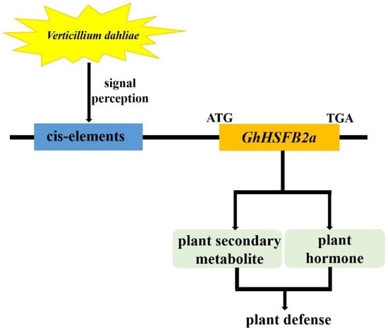 Plants respond to abiotic and biotic stresses through developmental, physiological, and biochemical pathways that are regulated by a network of transcription factors, including HSFs. HSFs are important factors in the regulation of plant stress resistance and play a vital role in plant stress response, growth, and development regulation [7]. Studies have shown that HSFB is also involved in the regulation of plant immunity, but the mechanism is not clear. In our previous study, A. thaliana inoculated with V. dahliae was sequenced using transcriptomics and metabolomics. We found that one of the DEGs was significantly upregulated by V. dahliae. It is homologous to G. hirsutum GhHSFB2a; the V. dahliae-induced expression pattern of GhHSFB2a rose at 0.5 h and was significantly upregulated at 12 hpi. In addition, the promoter of GhHSFB2a contains a defense-reaction-associated cis-acting element-FC-rich motif. These results imply that GhHSFB2a may play a role in cotton plant response to V. dahliae.