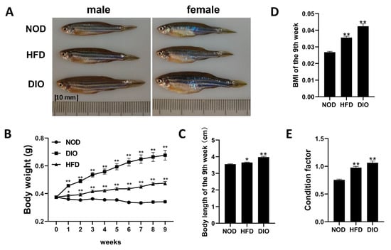 Both HFD and DIO induced obese phenotypes in zebrafish. (A) Lateral views of NOD, DIO and HFD zebrafish after 9 weeks of feeding. The distance between two dashes is 10 mm. (B) Changes in body weight during 9-week feeding experiments. (C) Changes in body length after 9 weeks of feeding. (D) Changes in BMI after 9 weeks of feeding. (E) Changes in condition factor after 9 weeks of feeding. *, p < 0.05, **, p < 0.01. Values are means ± SEM. Each group has 60 fish.