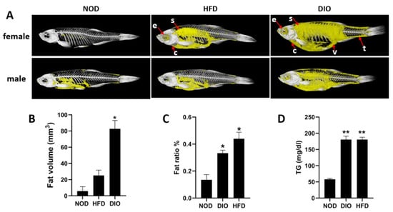 To quantify the fat volume in the total body of zebrafish, assays using in vivo micro-CT (micro-computed tomography) scans were performed. As shown in Figure 2A, there was only a small amount of fat accumulation in the viscera of NOD zebrafish, but a large amount of fat accumulation in the abdomen, subcutaneous, eyes, and around the heart and tail of both HFD and DIO zebrafish. Total body fat volumes in the DIO and HFD groups were significantly greater than those in the NOD group (Figure 2B). Consistently, the total lipid content of whole fish was significantly increased in both HFD and DIO fish (Figure 2C). Plasma triglyceride (TG) levels were also significantly (p < 0.01) higher in the HFD and DIO groups than in the NOD group after feeding for 9 weeks (Figure 2D). Thus, HFD and DIO zebrafish exhibited a significantly higher degree of fat distribution and lipid accumulation than NOD zebrafish.